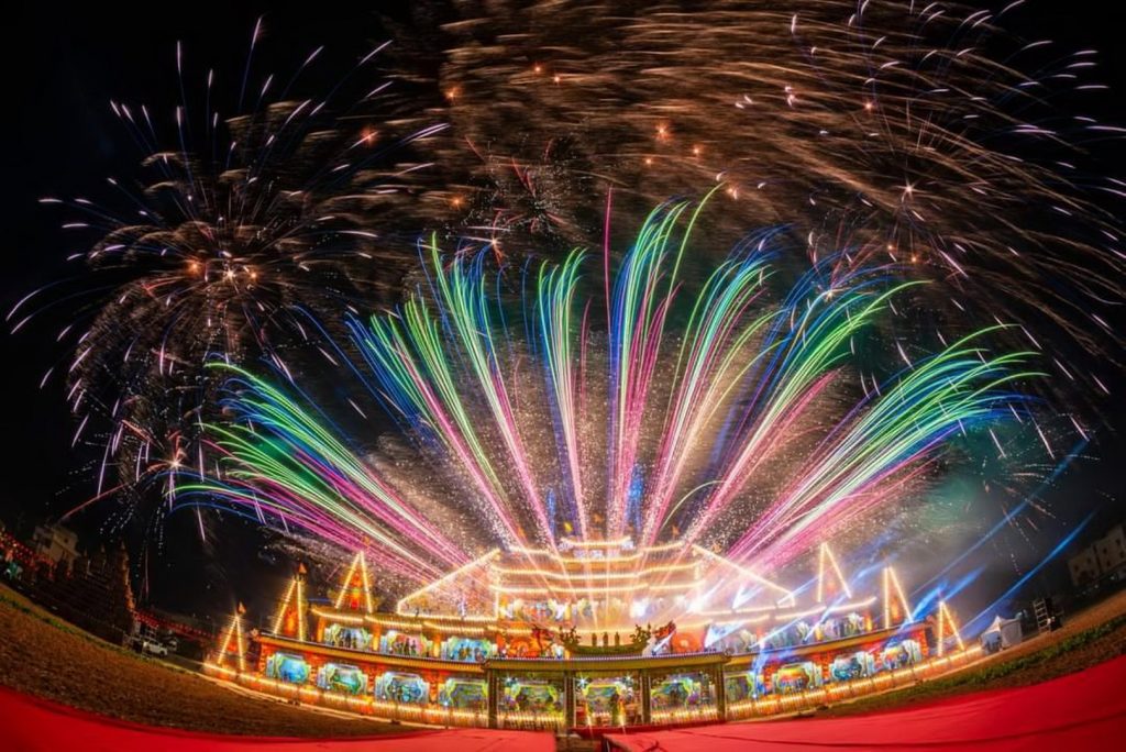 台中市龍井區聖德宮慶成祈安五朝清醮二十九日晚舉行盛大醮壇燈光特效煙火點燈儀式,民眾白天可欣賞醮壇裝置藝術,夜間燈飾金碧輝煌,絢麗煙火繽紛耀眼,精彩絕倫的燈光秀,讓鄉親、遊客大飽眼福。