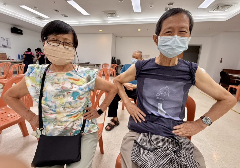 昨日上午8時許,台中 醫院「流感專區」外就已經有排隊民眾等候接種疫苗,其中一對82歲陳先生跟80歲陳太太,夫妻倆手牽手連袂前往,雙手叉腰接種「左流感、右新冠疫」雙疫苗,兩人說每年1日都準時到醫院報到接種疫苗,兩人開心叉腰拍照,被現場防疫醫護比大拇指稱讚是「防疫模範夫妻」!