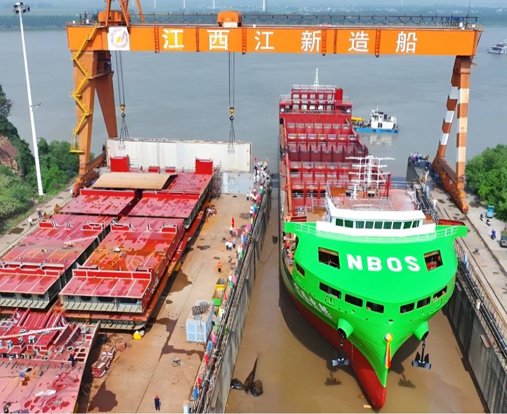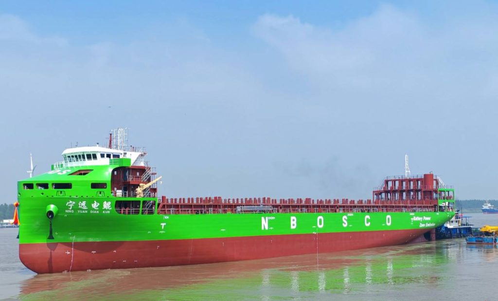 寧波遠洋740TEU純電動海船首艘船在江西江新造船廠下水,意謂著該船的船體建造與核心動力系統搭載已全面完成,整體建造進入新階段,為後續交付投用奠定基礎。(見圖)