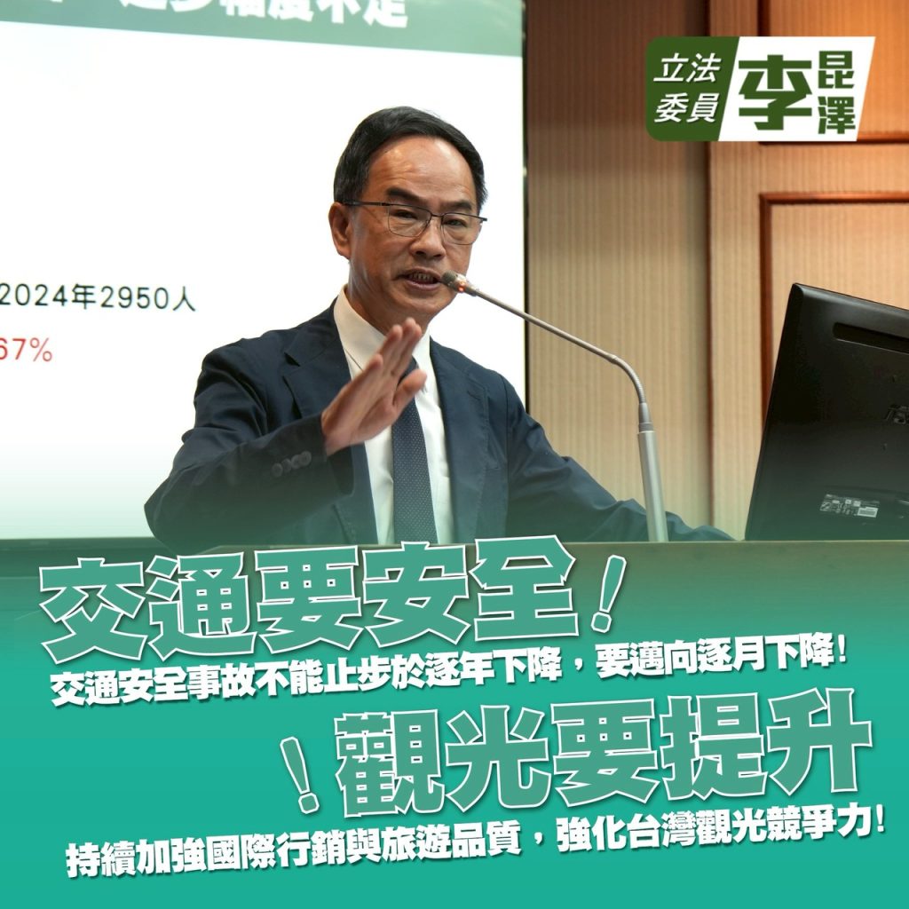 立委最後表示,交通安全與觀光發展直接影響民眾生活與國家經濟,政府應持續優化交通措施,降低事故風險;同時透過有效行銷與政策規劃,讓台灣觀光更具競爭力,實現交通部施政承諾及民眾期待。