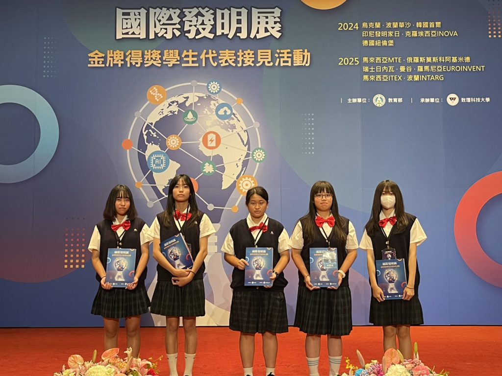 五位女學生的團隊研發的三項作品「智能車內空氣檢測系統」、「智慧窗簾」及「會發光足跡」分別在俄羅斯莫斯科阿基米德國際發明展、馬來西亞國際發明展勇奪金牌,展現結合理論知識與實務應用的創意創新能力。