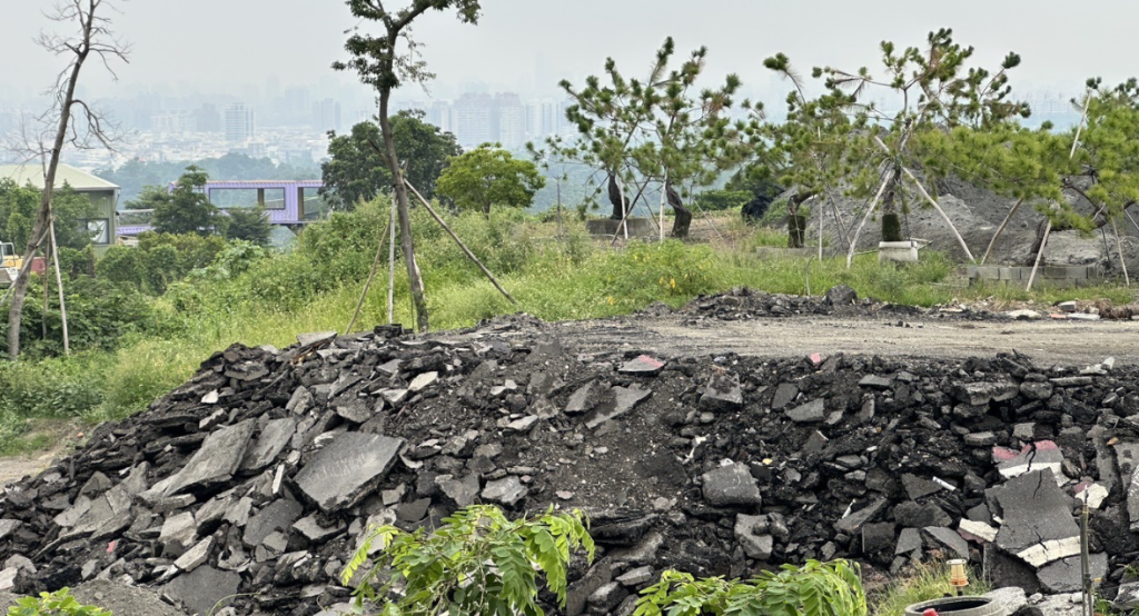 陳麗娜指出,空拍對比,大坪頂保護區二○二○年是綠林,今年卻滿地廢瀝青、怪手挖掘、砂石車傾倒,水保區竟成垃圾場。