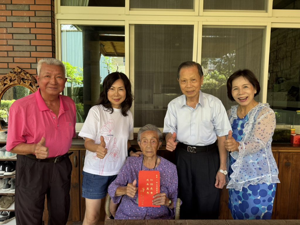 一0四歲的何張月英,是台中市議員何文海的母親。老太太見到蕭董事長,十分高興,還提到幾位親朋故舊,回憶往事。董事長稱讚老人家的記性很好。另一位一0五歲的黃江犁,在兒媳照顧下,氣色不錯。老太太兒子黃木添感謝蕭董事長連續三年親自前往道賀,她提到老母親九十幾歲時,還每天到菜園,近幾年體力稍退。蕭董事長祝福老太太平安健康,延年益壽。