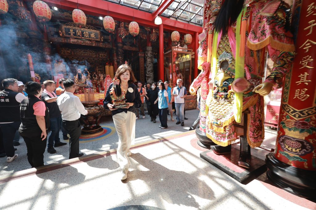 得意堂十組慶祝田都元帥聖誕遶境活動十四日於廟口奠濟宮正式啟行,副市長邱佩琳親自出席在奠濟宮的團拜盛會。(基隆市政府提供)