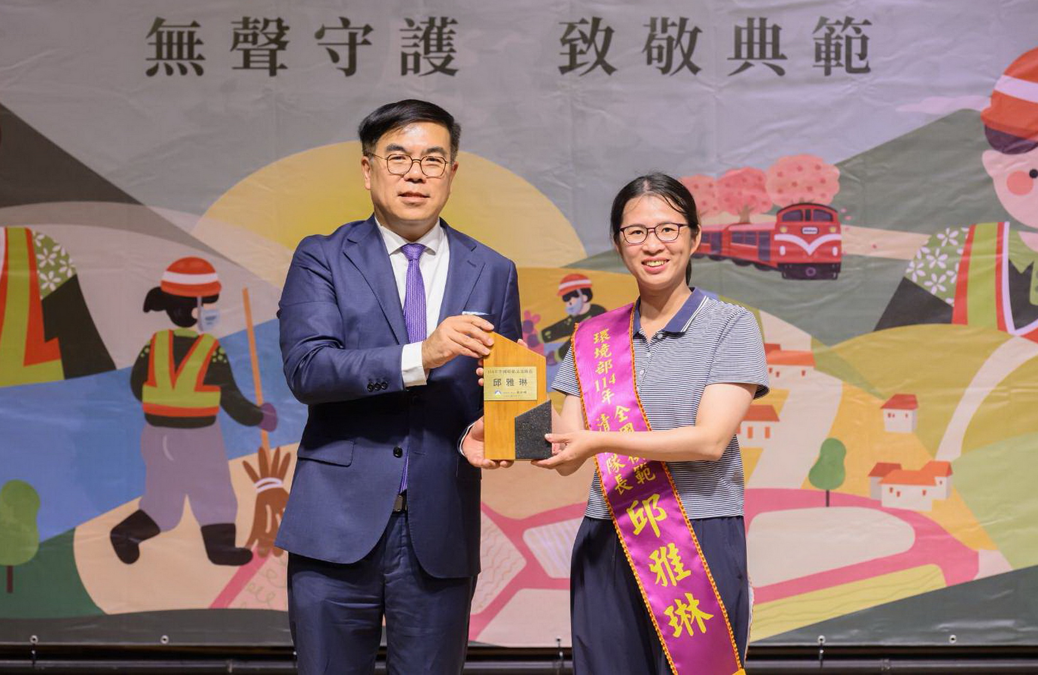 環境部每三年辦理全國模範清潔隊長遴選,從全國三百六十八個鄉鎮市區薦送五十四位清潔隊長,由前十名當選模範清潔隊長,台中市政府環保局清水區清潔隊長邱雅琳是一一四年度當選人員之一,十五日接受環境部頒獎表揚,日前才帶隊挺進花蓮光復鄉協助災後復原的她,不畏高溫泥濘、化身女力超人,可說是帶隊帶心、實至名歸。