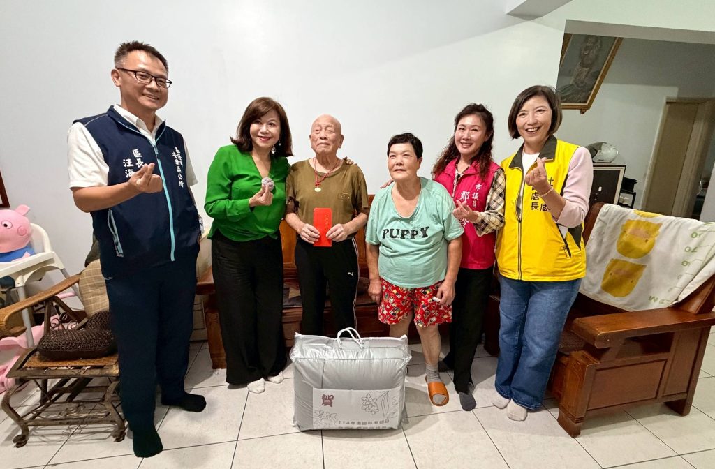 九九重陽將至,基隆市副市長邱佩琳代表市府前往探訪三位百歲人瑞,分別為周樹芬、吳威融及董華英,並在社會處副處長盛慧中、副發言人張家馨陪同下,致贈重陽敬老禮金六千元、禮品、金鎖片及總統府敬老狀,向長輩們表達最誠摯的敬意與祝福,傳遞市府對高齡長者的關懷。也祝福全體長者重陽佳節快樂、福壽安康,期盼每位長輩都能安享晚年、樂在生活。