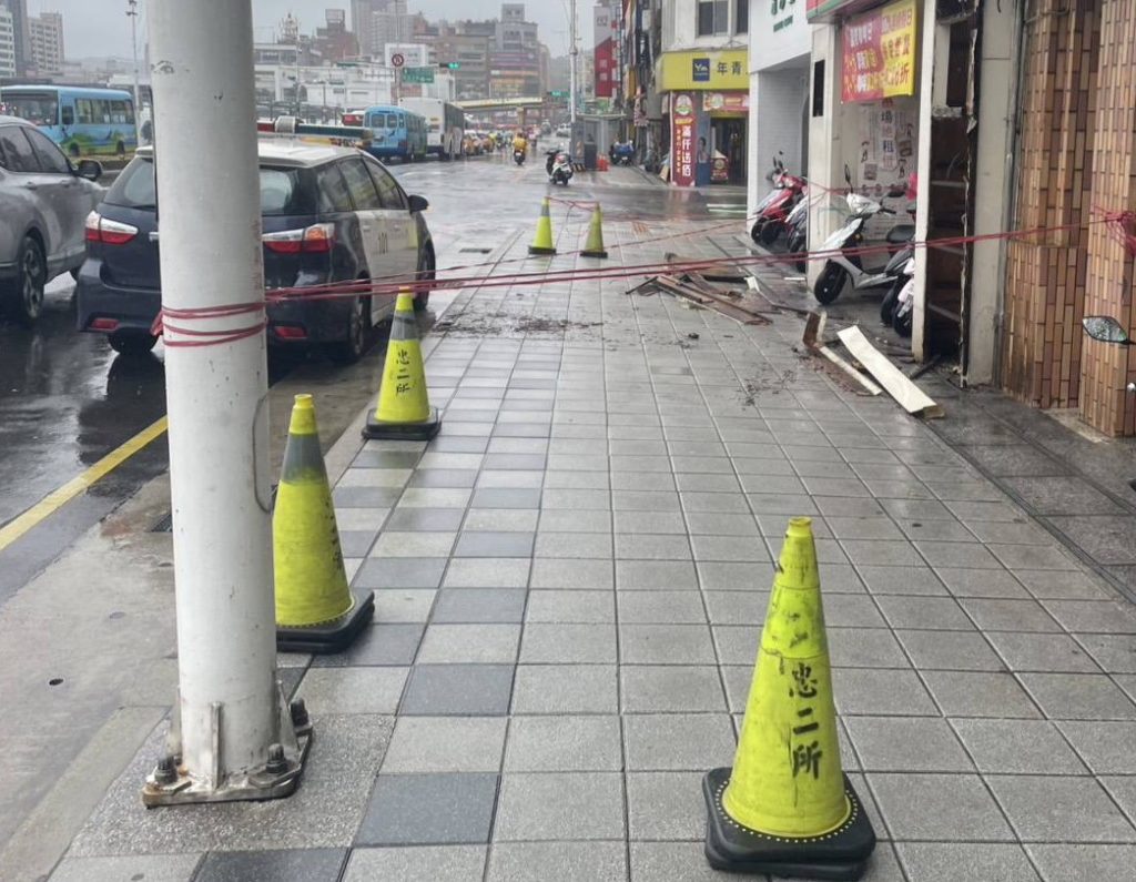 警一分局忠二路派出所警員陳誌偉、實務訓練員警王安庭,二十日上午十一點左右接獲報案指稱,轄內基市忠一路上有招牌因不敵強風而掉落在人行道,員警獲報後立即趕到現場。