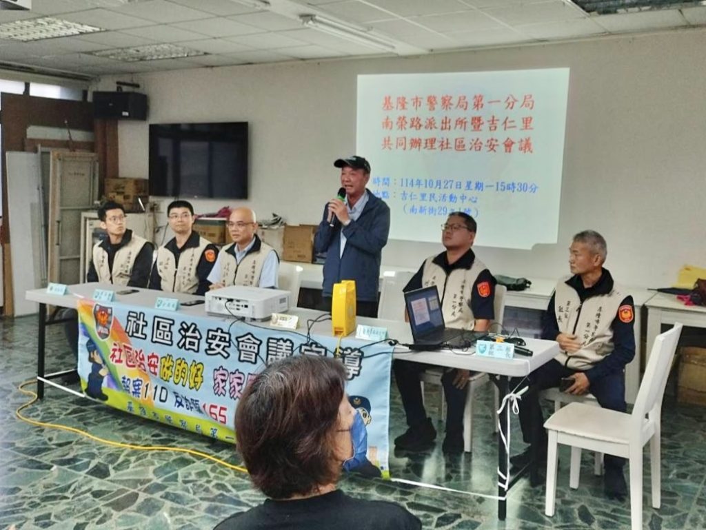 基隆仁愛區吉仁里社區治安會議,基隆員警教授識詐,守住市民荷包。市警一分局為提高社區鄰里識詐觀念,廿七日在仁愛區吉仁里辦理社區治安會議,會議由里長李建德主持,警一分局員警向現場民眾,說明近期詐騙手法,提醒民眾務必謹慎留意,保護自身財產安全。