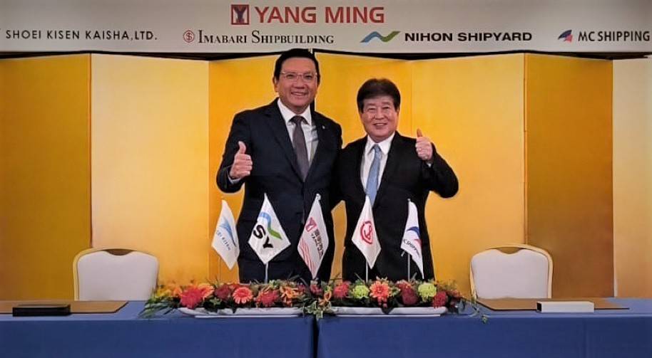 陽明海運完成六艘8,000 TEU級甲醇雙燃料預置全貨櫃輪合約簽署,陽明海運與日本造船株式會社(日本造船”)、今治造船株式會社(今治造船”)及正榮汽船株式會社(正榮汽船)在日本今治國際飯店舉行8,000 TEU級甲醇雙燃料預置全貨櫃輪簽約儀式,由陽明海運蔡豐明董事長及日本造船檜桓幸人董事代表簽署購入三艘建造中新船與三艘新船建造合約。(見圖左及右為陽明海運蔡豐明董事長、日本造船株式會社檜桓幸人董事,陽明海運提供)