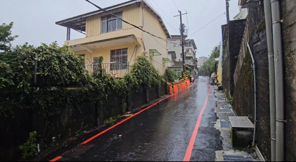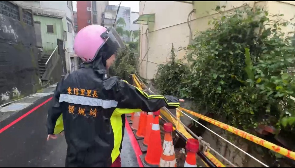 賴佩琦接獲災情馬上通知市府,工務處養護工程科長廖俊育第一時間到場,初步看來未影響道路地基,立即拉上封鎖線警戒,提醒人車注意,圍牆年久失修,且上方有盤根錯節的植栽,增加重量導致,後續會交由市府綜發處維修。