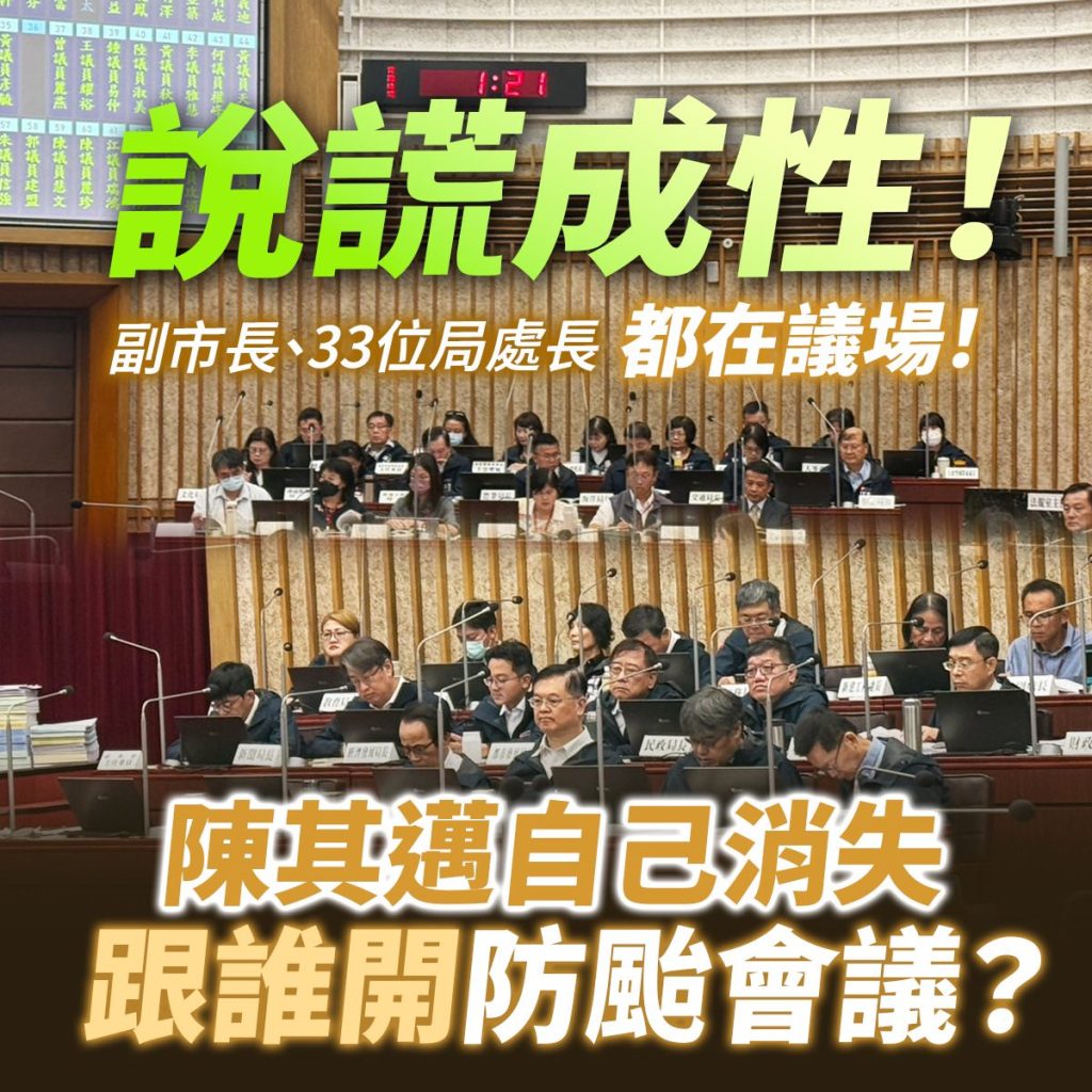 白喬茵再指出,陳其邁被拍到十一點卅五分離開議事廳躲進休息室,直到十三點卅二分才離開議會,也就是,他人根本沒去甚麼防災會議,而是在議會小房間裡展開兩個小時的大休息,懶得面對議員的眾多質疑。