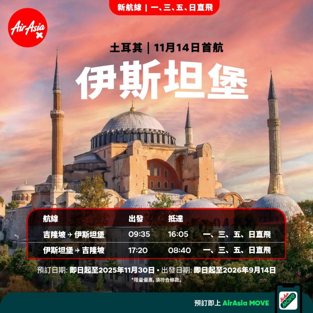 AirAsia X 每週營運 四班吉隆坡—伊斯坦堡往返航班,每年提供超過 15 萬個座位,單程含稅最低TWD 5799元起,優惠票價即日起至 2025 年 11 月 30 日開放預訂,旅遊期間至 2026 年 9 月 14 日止,旅客可透過 airasia.com 或 AirAsia MOVE App 訂票。
