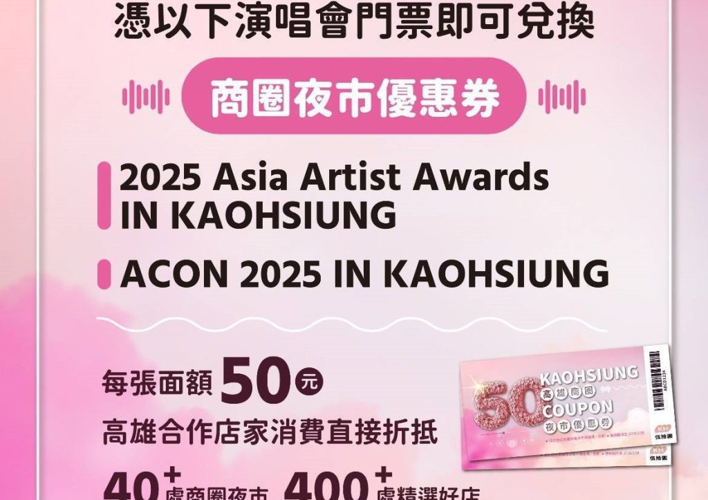 韓國指標性娛樂盛典「Asia Artist Awards(AAA亞洲明星盛典)」典禮,六日首次移師台灣在高雄世運主場館舉辦,適逢典禮十週年,將集結廿二組華麗卡司,接著七日還有「ACON音樂節」,兩日盛大K-pop活動,為歡迎遠道而來的歌迷們,高雄再推出面額五十元的商圈夜市優惠券,粉絲憑演唱會門票即可兌換。