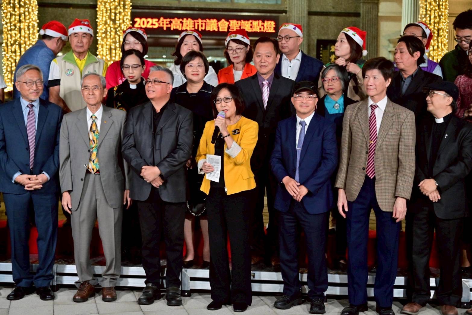 高雄市議會八公尺高的聖誕樹,4日晚間點燈,議長康裕成偕同議員及市民朋友在議會前庭廣場共同見證,邀請高雄市基督教福音聯盟協會楊錫儒理事長率24位牧師,為城市獻上祝福,在國際賽事屢獲佳績的陽明國中管樂班也帶來悠揚音樂,帶領大家提前迎接溫馨聖誕。