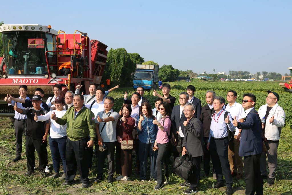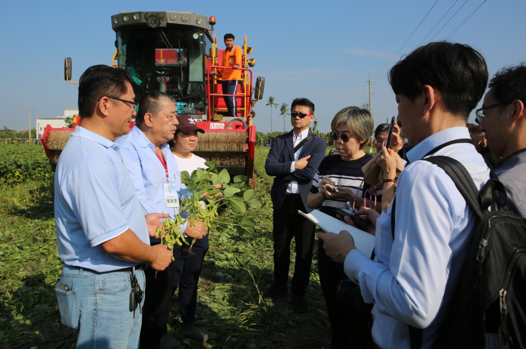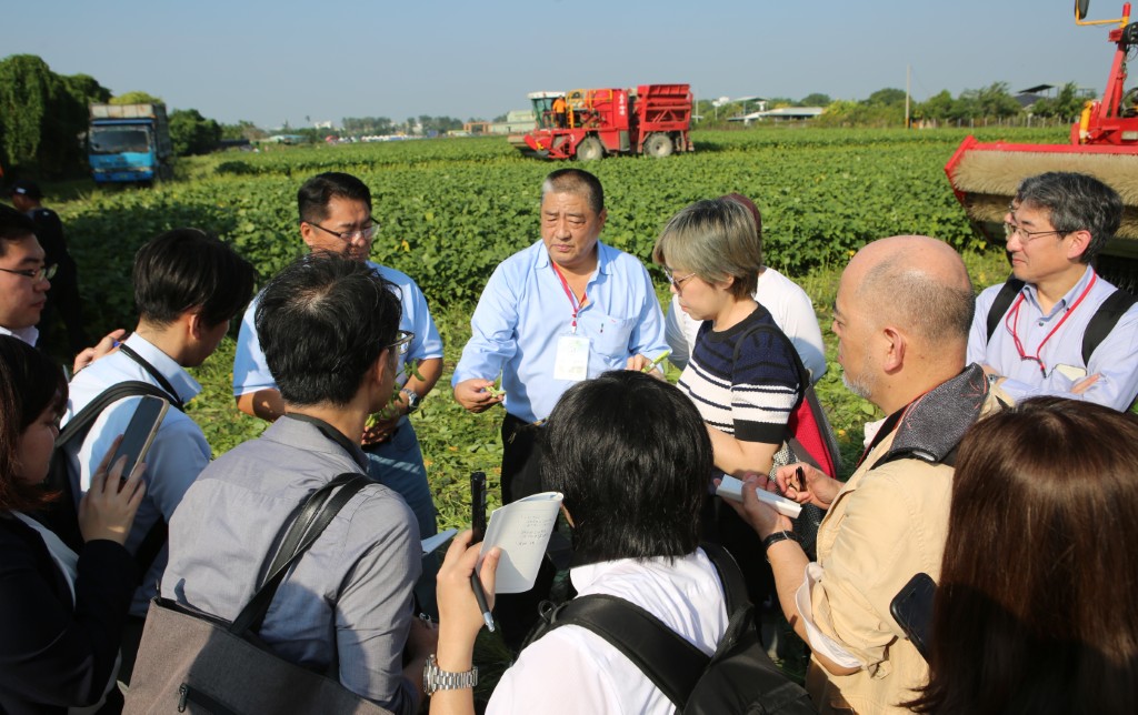 日本媒體來台參訪台灣機械化採收毛豆。 ( 記者許正雄攝)