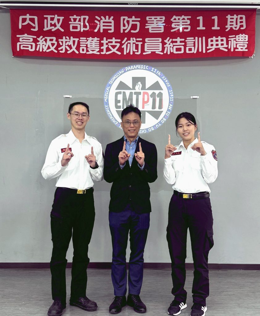 高雄市消防局中華消防分隊隊員黃子寧與六龜消防分隊隊員盧建豪,參加內政部消防署 「第11期高級救護技術員(EMT-P)訓練」,分別以總成績第1名及第3名的優異成績結訓 。