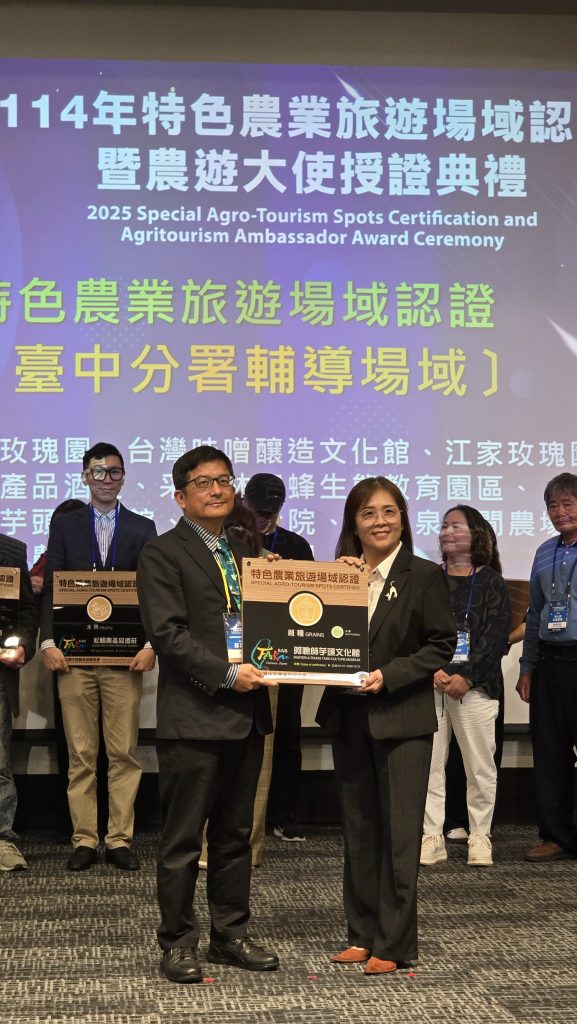 台灣休閒農業發展協會主辦「114 年特色農業旅遊場域認證暨農遊大使授證典禮」,阿聰師芋頭文化館榮獲「雜糧類特色農遊場域認證」,由蘇茂祥副署長及張國禎理事長親自授證,象徵文化館在在地特色、產業文化與永續理念上的努力獲得肯定。