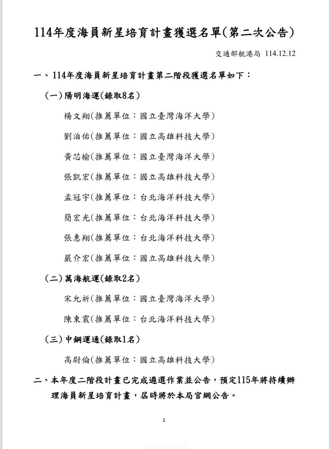 交通部航港局公布114年海員新星 1.0 第二階段入選名單,航港局副局長劉志鴻主持114年「海員新星培育計畫」公布第二階段獲選名單,共計有11名學生入選,自計畫推動至今,於今年度累計錄取人數已突破百人,成為「小海星」的學生們將成為我國海運產業的未來新星。(見附表及圖,航港局提供)