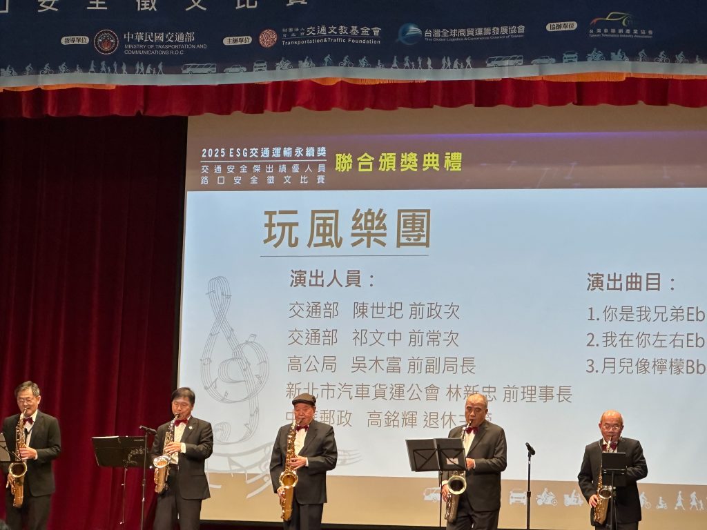 由交通部指導、台北市交通文教基金會與台灣全球商貿運籌發展協會共同主辦的「2025 ESG交通運輸永續獎、交通安全傑出績優人員暨路口安全徵文比賽」聯合頒獎典禮,於12月12日於集思交通部國際會議中心盛大舉行,並在交部前政務次長陳世圯及前常次祁文中等組成《玩風樂團》精彩的演出中揭開序幕。出席本屆盛會的來賓涵蓋產、官、學各界,包括前行政院劉兆玄院長、交通部陳彥伯政務次長、伍勝園政務次長、林國顯常務次長等嘉賓皆親臨現場,共同見證推動交通運輸永續發展的重要成果。