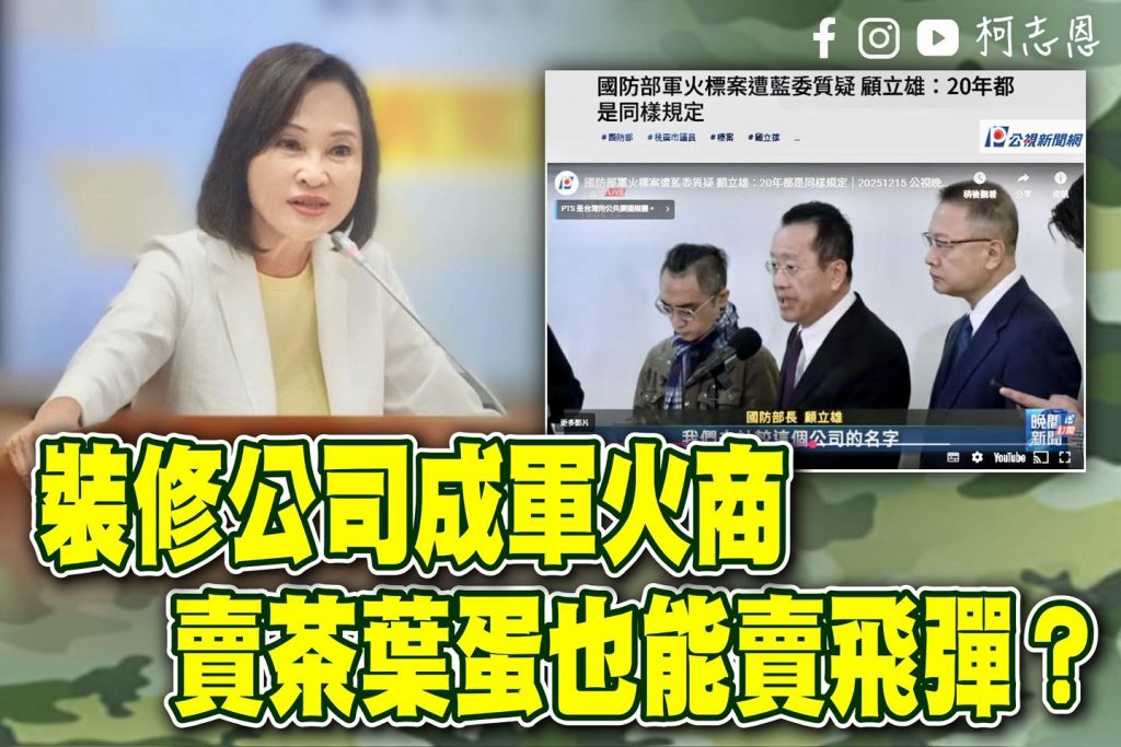 柯志恩質疑,裝修公司成軍火商,賣茶葉蛋也能賣飛彈?這年頭,吃銅吃鐵不稀奇,吃炸彈才是真本事。