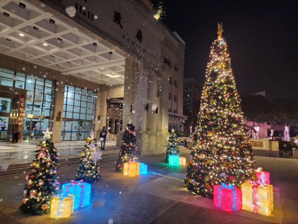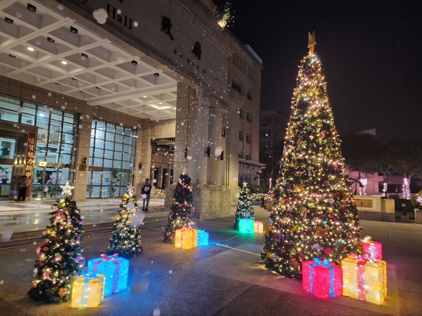 豐原陽明市政大樓十七日(豐原區陽明街)正式點亮聖誕樹、光瀑布及周邊燈飾,整點搭配飄雪效果,營造浪漫的「雪國聖誕」氛圍。