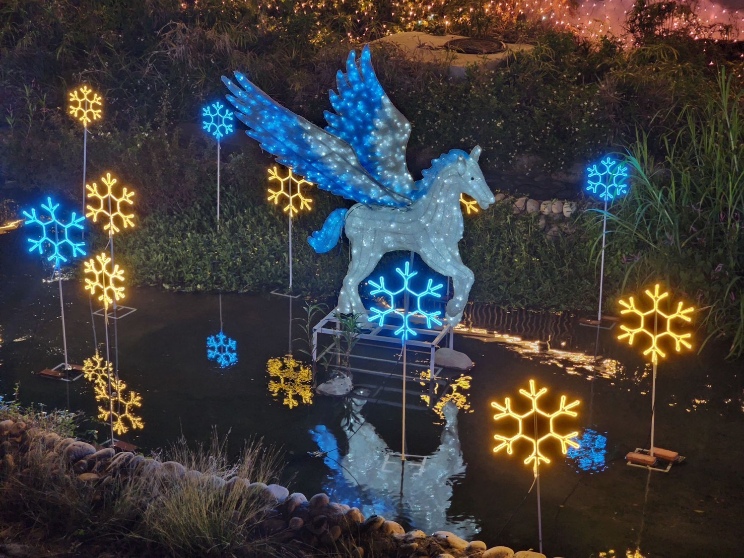 豐原葫蘆墩公園第三、四區沿岸的軟埤仔溪燈區,以童話、祝願與馬年寓意打造「水光聖誕」、「雪之心境」、「愛之緞帶」及「一飛衝天」四大光景,透過「光 × 水 × 倒影」形塑沉浸式散步體驗,吸引民眾於冬夜駐足觀賞。