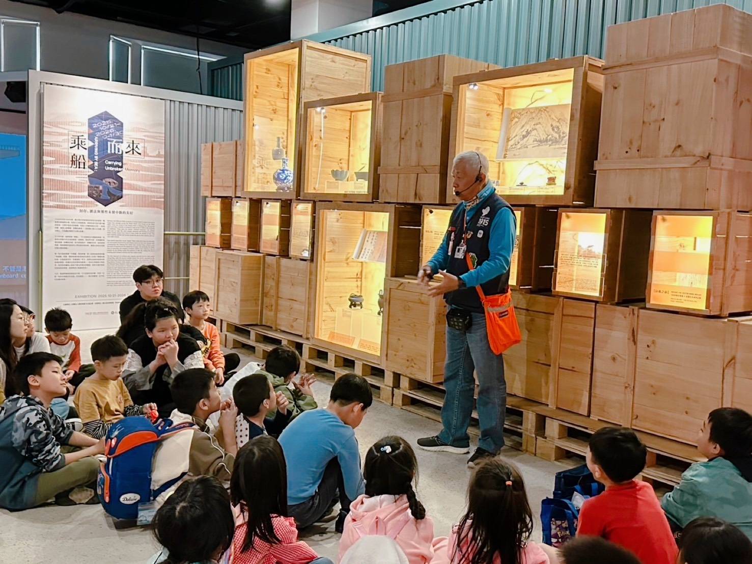 陽明海運文化基金會昨(17)日邀請基隆市小衛星課後照顧據點的孩童前往該會所屬陽明海洋文化藝術館,參觀「乘船而來─封存、遞送與那些未曾中斷的美好」展覽。孩子們在導覽老師的帶領下,認識故宮文物1948-1949年渡海來台於基隆港上岸的歷史,也理解基隆如何以港口迎接世界,更在看展的過程更加親近自己的生活城市。