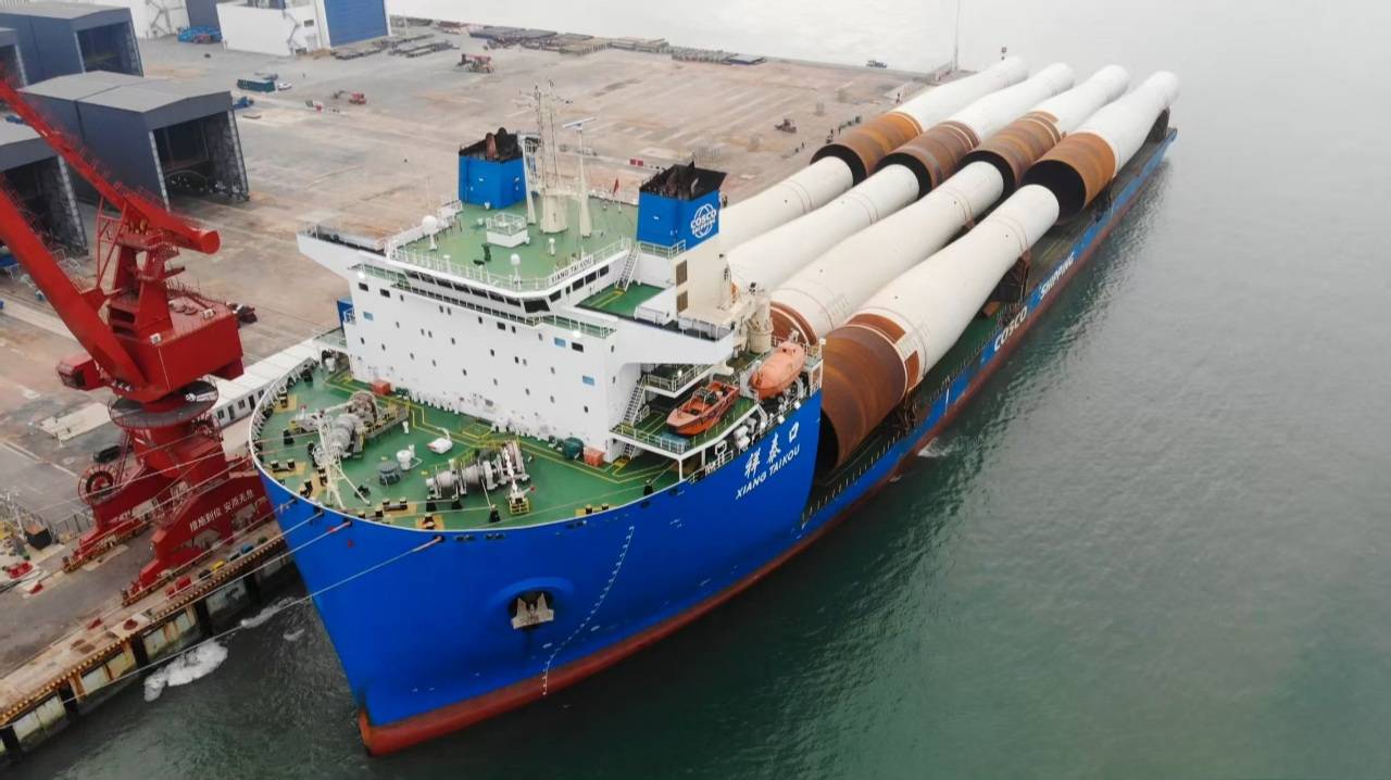 半潛船“祥泰口”輪滿載八根海上風電單樁從欽州港鳴笛起錨駛住英國,此係中國大陸出口歐洲的最大批量海上風電單樁項目完成裝船交付,欽州亦成為海上風電裝備出口樞紐港。(見圖)
