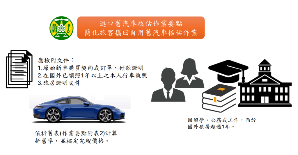 為簡化核估作業,民眾可清楚瞭解其應繳納之進口稅費,並避免徵納雙方爭議,爰於作業要點第8點增訂,旅客因留學、公務或工作,而於國外旅居超過1年,提供原始新車購買契約或訂單、付款證明及在國外已領照1年以上之本人行車執照,並檢附旅居證明文件者,海關得直接依折舊表(作業要點附表2)計算折舊率,並核定完稅價格。
