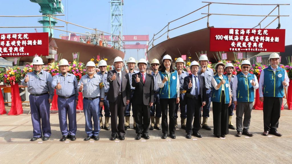 台灣國際造船公司承造海洋委員會國家海洋研究院「100噸級與300噸級海洋基礎資料調查船」,昨(22)日在台船公司高雄廠區舉行安放龍骨典禮,由台船公司蔡坤宗總經理及海洋委員會國家海洋研究院陳璋玲院長共同主持兩型船安放龍骨祈福儀式,祈求建造順利,人員平安。(見圖,台船提供)