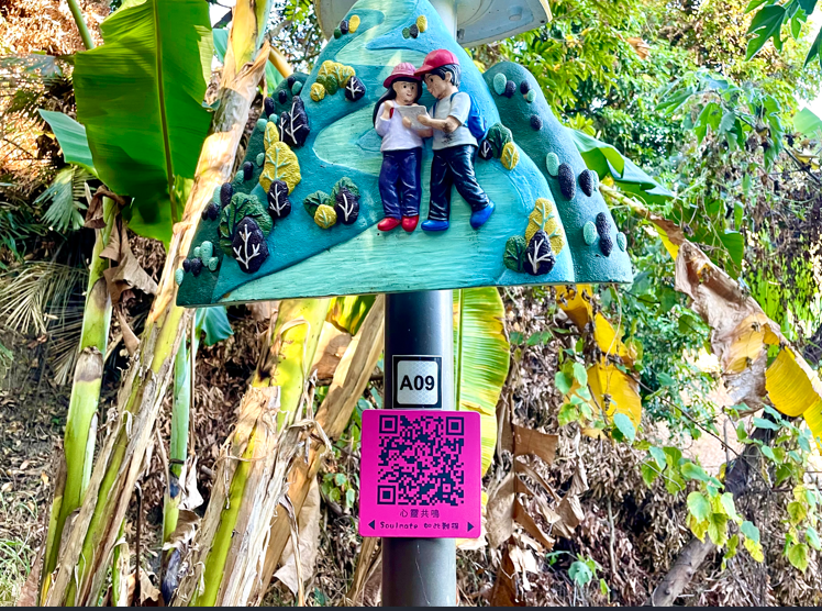 觀旅局說明,步道沿線設置多處QR Code與甜蜜互動裝置,遊客可邊走邊掃描、閱讀故事內容,或留下合影紀念。來到山頂的「小狗鞦韆」時,不妨停下腳步,透過數位互動深入了解「小久」與「阿知」對未來的想像,或許也能在故事中,看見自己與家人、伴侶的影子。這不只是一趟爬山行程,更是一場與自己、與重要之人對話的心靈旅程。