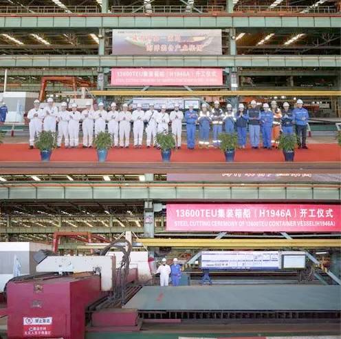 滬東中華為Seaspan建造的第四艘1.36萬TEU型貨櫃船H1946A在西部廠區點火開工,Seaspan駐廠經理南相福,DNV船級社專案經理肖華,滬東中華貨櫃船總建造師劉學東等參加開工儀式。(見圖)