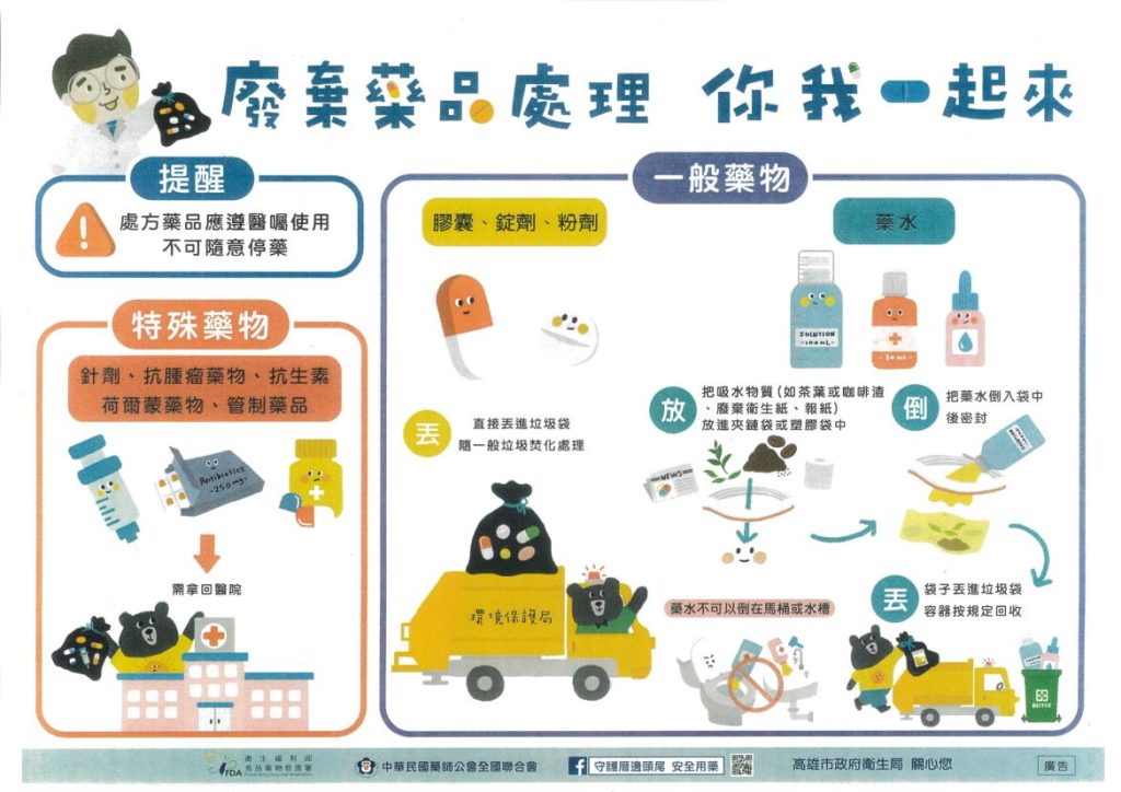 衛生局特別指出,目前高雄市9家市立醫院包括市立民生、聯合、凱旋、中醫、大同、小港、旗津、鳳山及岡山等,以及大寮區、林園區、旗山區、美濃區、橋頭區及路竹區等22區提供醫療服務的衛生所,亦提供廢棄藥品回收服務,市民可將過期、變質或已停止使用之藥品,交由院所協助回收處理,避免隨意丟棄造成風險。