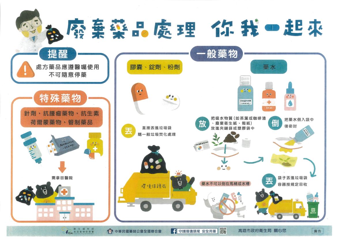 為避免廢棄藥品遭誤用或不當棄置,造成用藥風險及環境汙染,高雄市衛生局持續推動廢棄物藥品正確處理與回收措施,呼籲市民依照廢棄藥品「倒沖集混封口」6口訣處理,善用本市9家市立醫院及22家提供醫療服務的衛生所,將廢棄藥品妥善回收,共同守護用藥安全與環境永續。