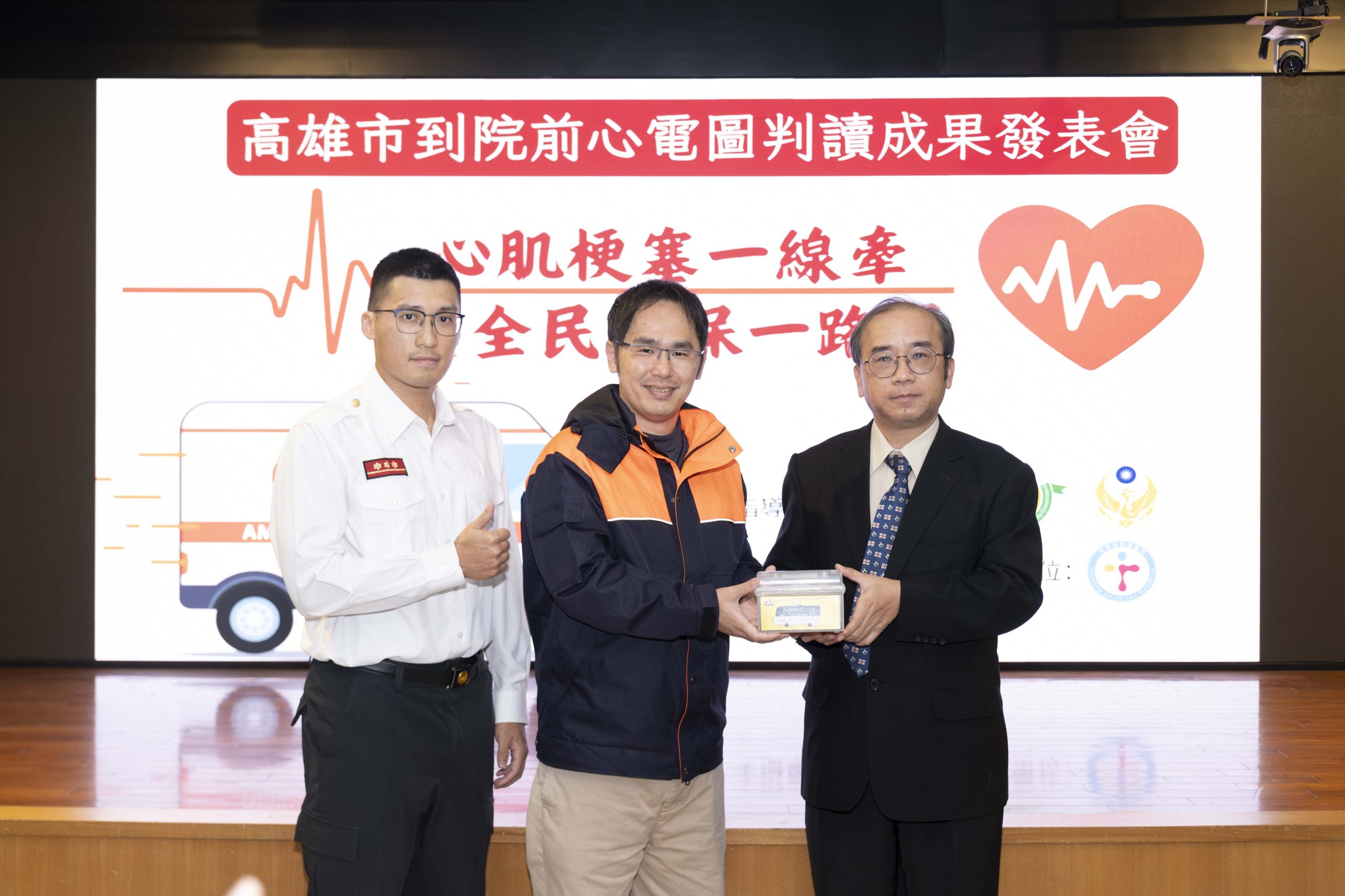 台灣心肌梗塞學會榮譽理事長 黃偉春醫師(右1),特別致贈高雄市消防局「高雄119守心藥盒」,象徵救護與醫療攜手合作,共同守護市民每一顆心臟。 (記者王正平翻攝)