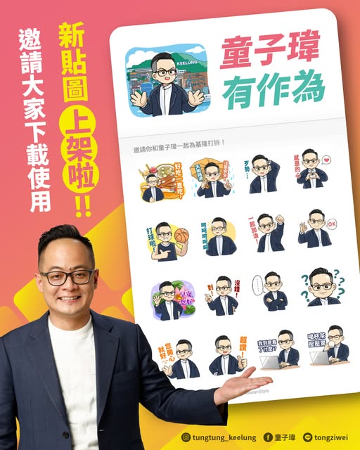 此外,六日童子瑋的進步基隆辦公室也推出第二波專屬LINE貼圖上架,這次在設計上以清爽、親切路線,加強五官辨識度,大家一眼就能認出「就是童子瑋本人」。整體風格簡單明快,不用過多特效字,也融入不少基隆人的生活日常,像是「天雨路滑」、夜市美食「好吃一直吃」,以及長輩常用的問候語,符合不同年齡層使用,更貼近大家的生活。