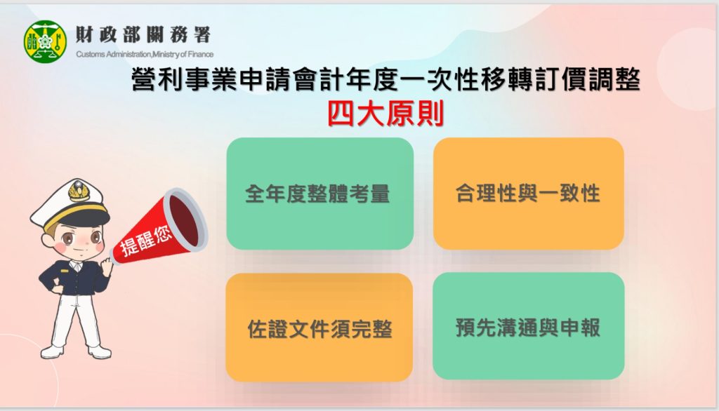 關務署進一步表示,若營利事業就同樣貨物僅部分報單註記申辦一次性移轉訂價,部分報單未註記,或為便於作業,將利潤集中於少數報單,導致同樣貨物完稅價格出現落差,與關稅估價規定不符,海關將不接受營利事業調整內容。因此,營利事業於申請會計年度一次性移轉訂價調整時,應對整個會計年度內進口貨物價格進行統一調整,而非針對單一報單或特定賣方進行選擇性調整,且申報之價格應符合國際移轉訂價準則,並與企業內部會計報表一致。營利事業應準備會計年度一次性移轉訂價進口貨物完稅價格核定申請書、進口報單與正式商業發票勾稽清表、交易合約、正式商業發票、付款單證或說明,及其他海關審查交易價格所需文件資料,亦可提供移轉訂價報告,俾利海關審查,加速核定。