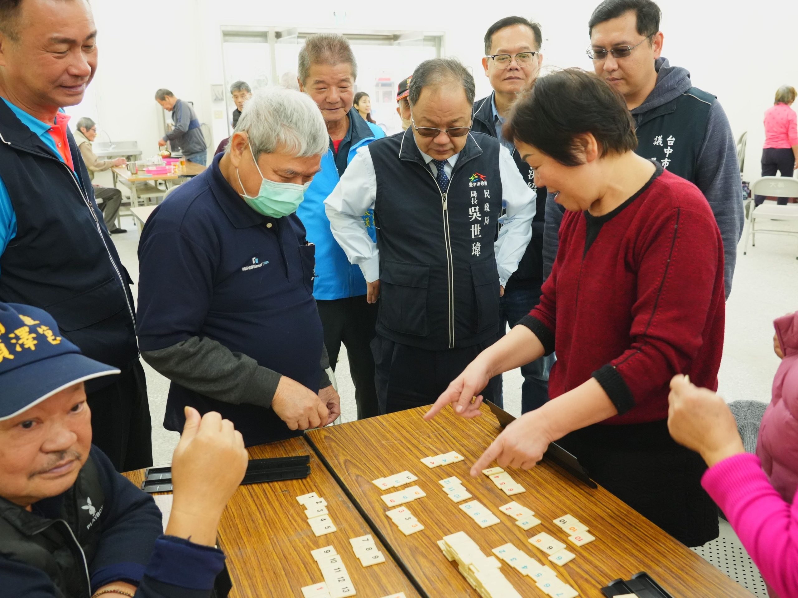 吳世瑋前往市民活動中心視察,關心長者參與活動情形,現場長者們分組圍坐,在輕鬆愉快的氛圍中專注投入以色列拉密桌遊。透過桌遊活動。