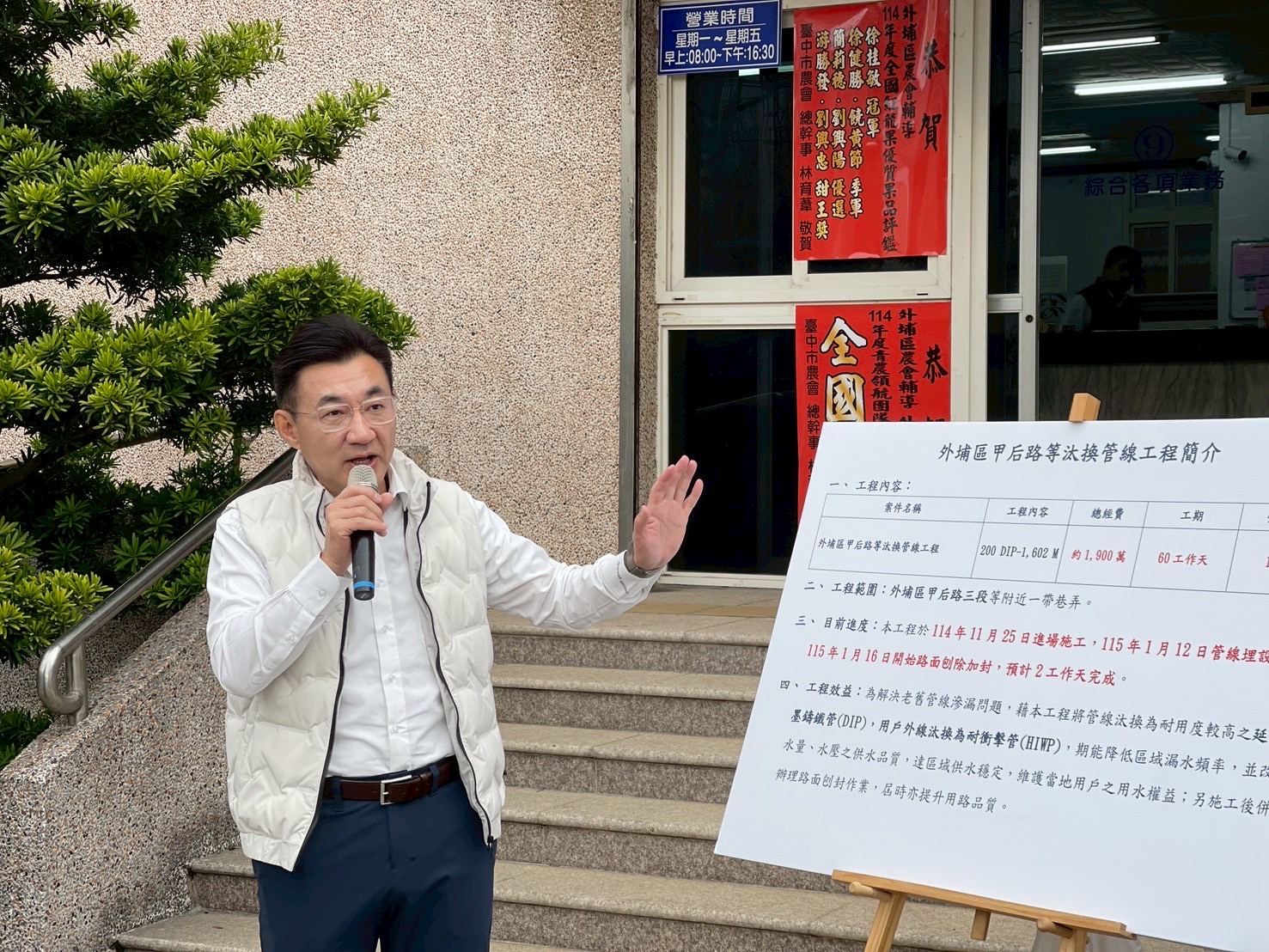 江啟臣指出,去年一月份他與市議員楊啟邦會勘外埔區甲后路四段與中山路的自來水汰換工程,總經費約四三六九萬,可望改善有將近五百戶受益。目前中山路部分已經完工,甲后路的部分已經完成管線汰換,待道路刨鋪完成後,可望提升外埔區的民眾的用水便利性。