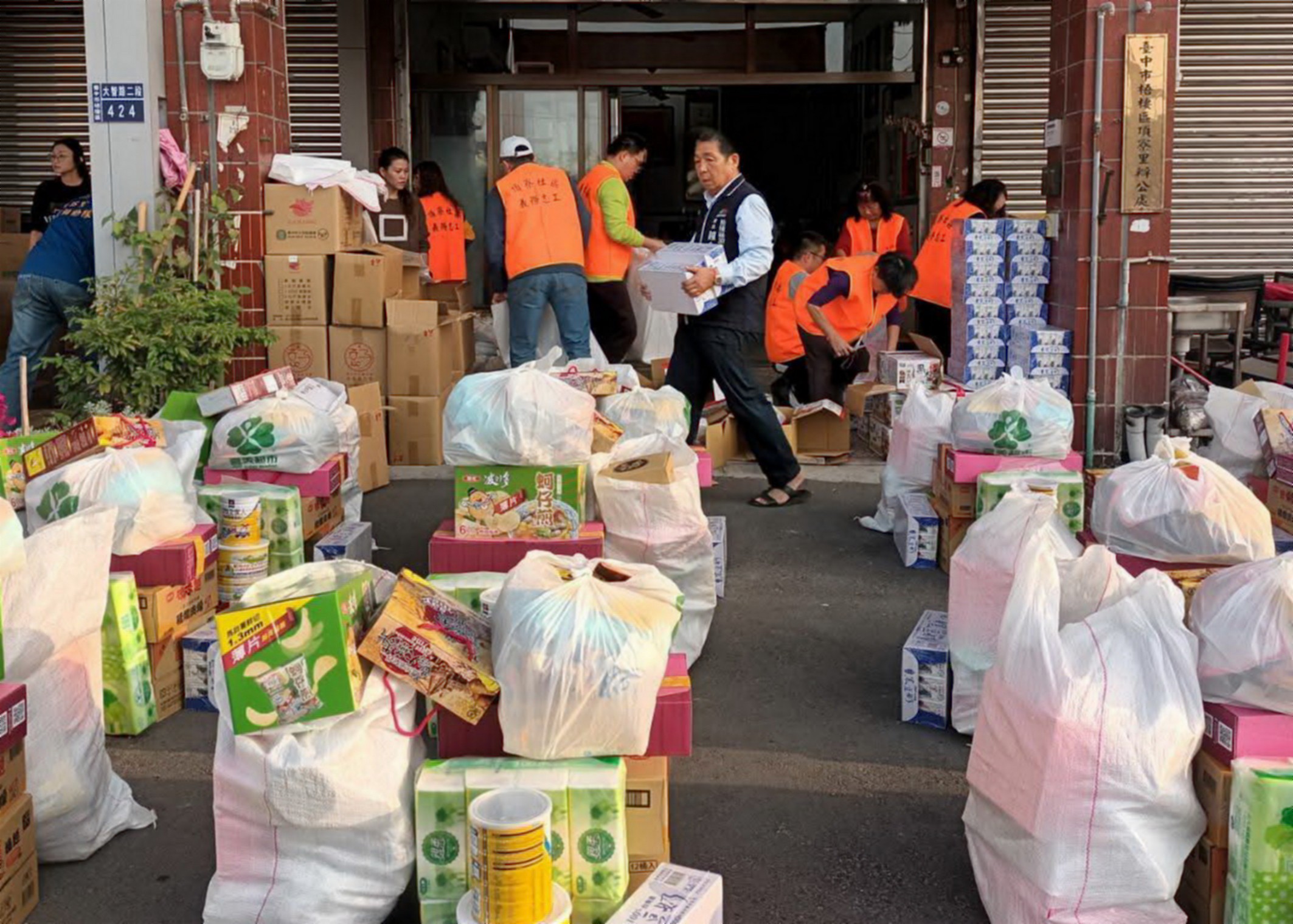 台中市議會議長張清照、梧棲區長溫國宏及志工也前往協助搬運物資給弱勢民眾。(記者陳金龍攝)