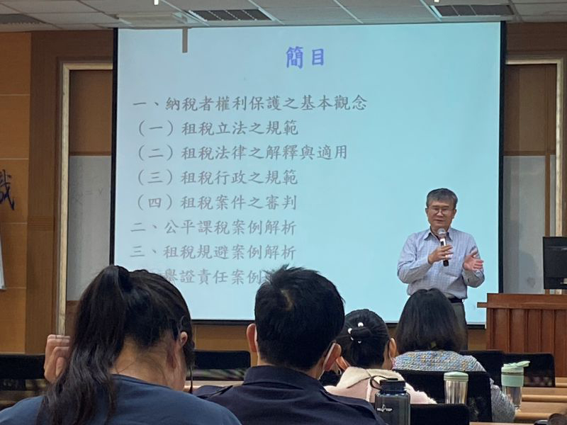 臺中關說明,本次訓練課程中,張教授提供精闢法律見解,解析納稅者權利保護法中關於租稅法律主義、基本生活所需不受課稅之權利、量能課稅原則、推計課稅、正當法律程序、租稅優惠等基本觀念,並就「公平課稅」、「租稅規避」、「舉證責任」等實務案例,以深入淺出之講述,讓海關同仁對於納稅者權利保護法之理論與實務有更深的認識,藉以精進法律素養,確保整體行政程序之完備。