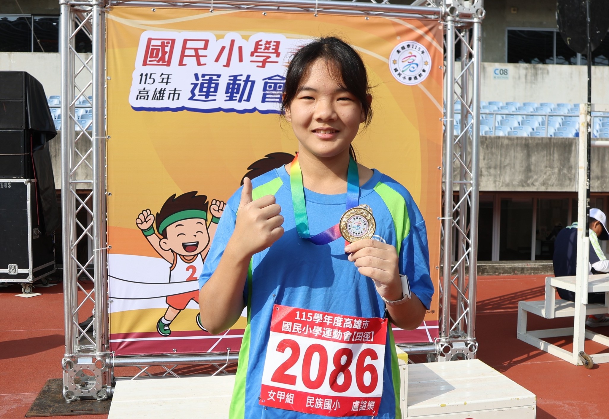 高雄市國小運動會首面金牌由民族國小六年級盧諠樂以七公尺九三,在女子鉛球項目奪下冠軍。 (記者王正平翻攝)