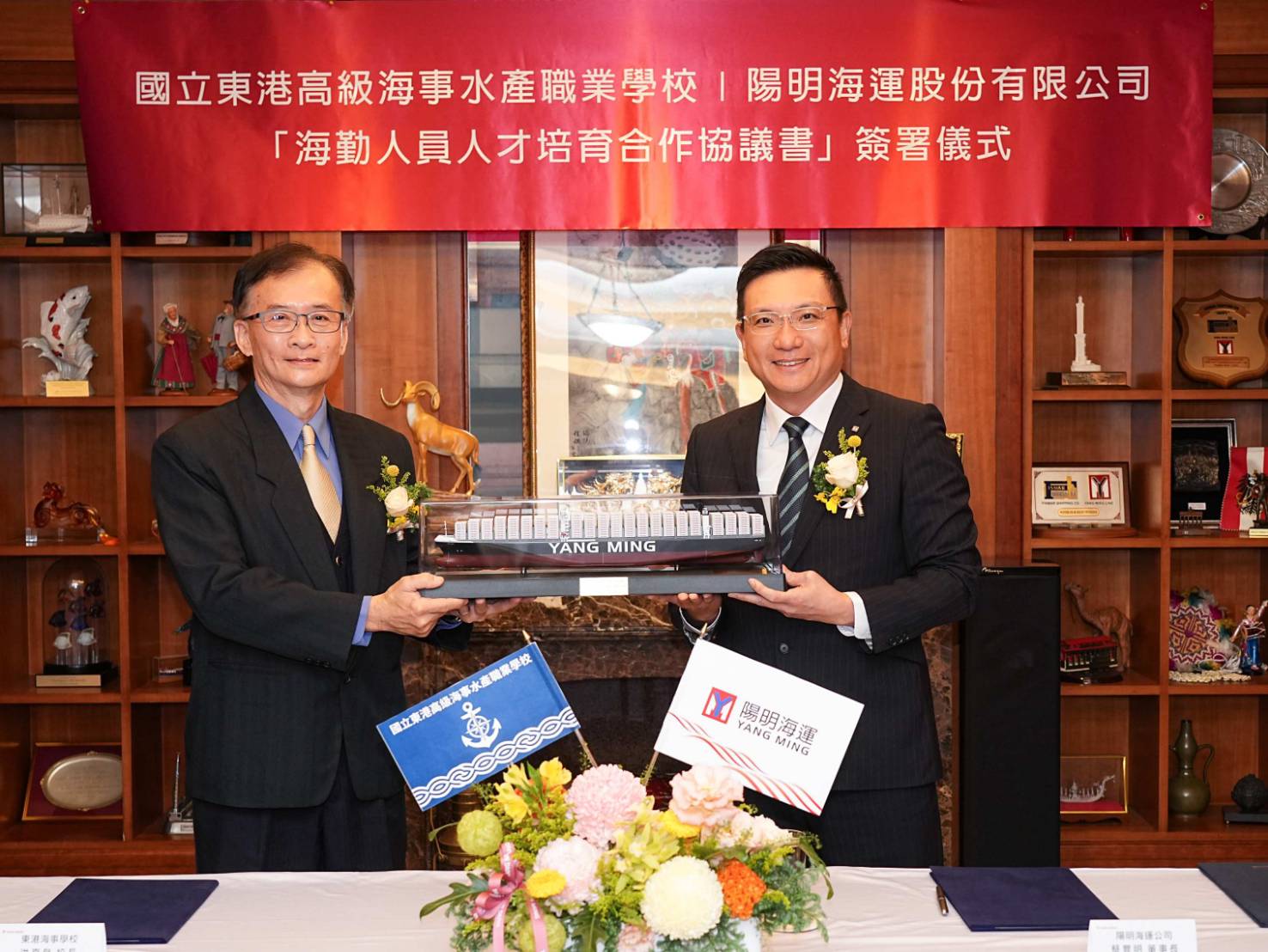 陽明海運公司秉持永續經營與培育人才之理念,昨(21)日在陽明海運總部大樓與國立東港高級海事水產職業學校(東港海事)舉行「海勤人員人才培育合作協議書」簽署儀式,由陽明海運董事長蔡豐明及東港海事校長洪嘉皇代表簽約。(見圖右及左,陽明海運提供)