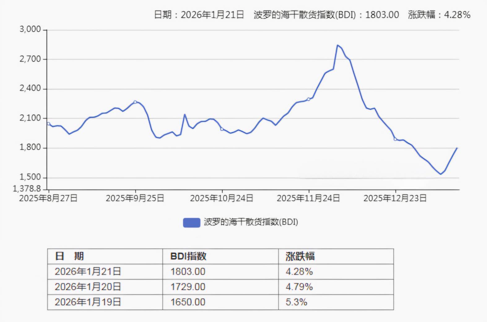 波羅的海航運交易所數據顯示,本週散裝船運市場運價走勢止跌回升,綜合運價指數(BDI)在本(一)月中跌破一千六百點回升至1/21的1803點。(見圖)