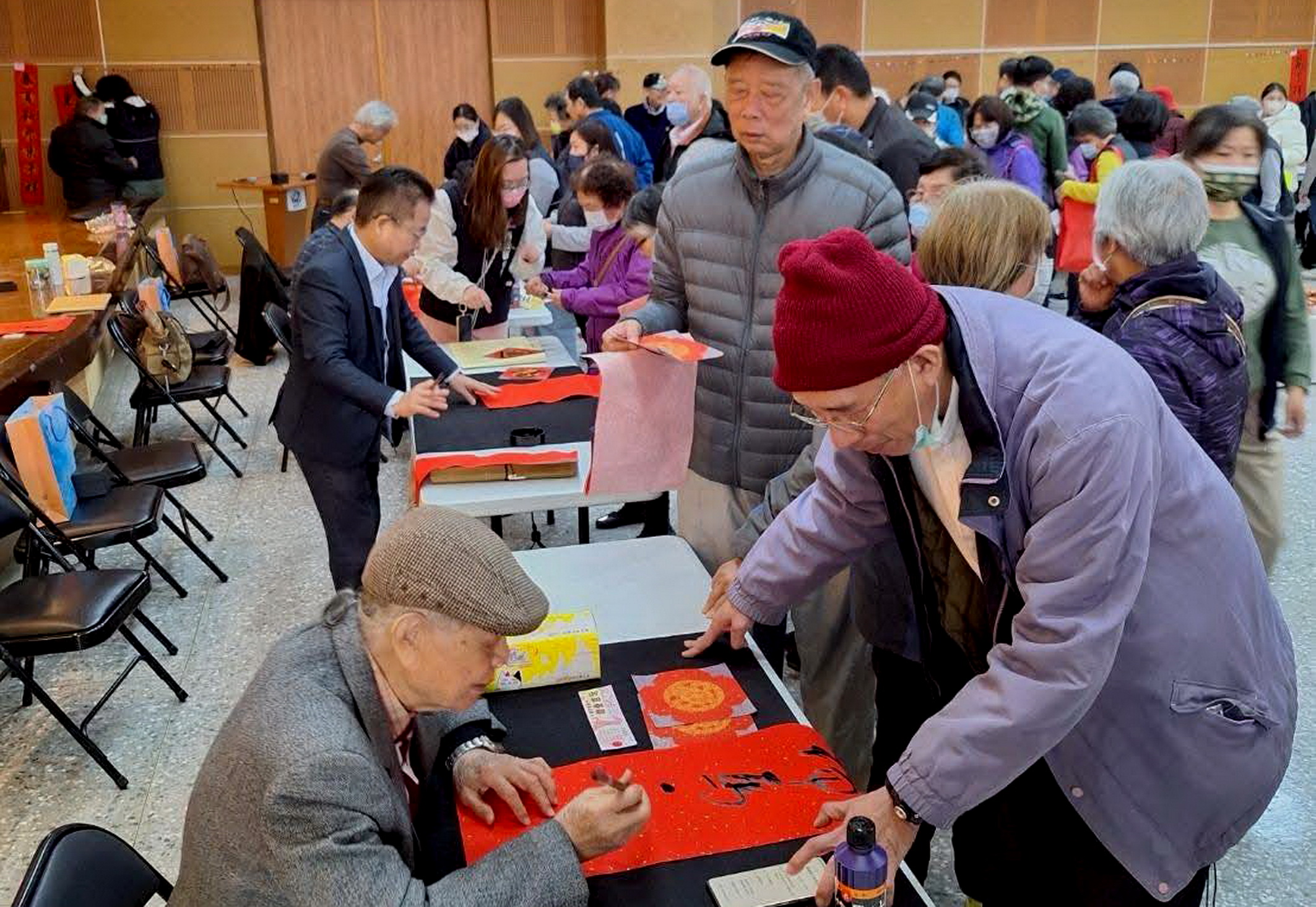 梧棲區公所二十二日上午在公所四樓禮堂舉辦春聯揮毫活動,由區長溫國宏主持,一早發放號碼牌,現場排隊人潮不斷年味滿滿、熱鬧非凡。