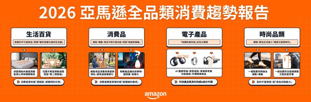據亞馬遜全球開店發表今(2026)年全球消費趨勢報告指出,AI功能、體驗導向和綠色環保等趨勢突顯,成驅動產品創新重要動能,消費電子以AI功能驅動開創產品成長新藍海。(附圖由亞馬遜全球開店提供)