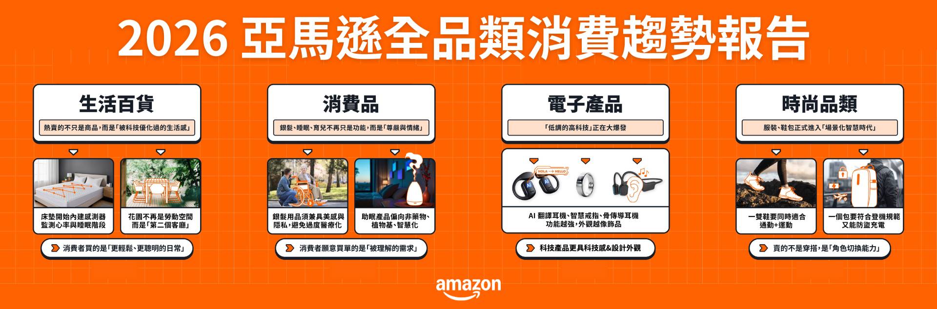 亞馬遜全球開店發布《2026年全球消費趨勢報告》,整合亞馬遜美、歐、日站點的消費洞察,解析全球消費需求變化,並聚焦消費電子、生活百貨、消費品與時尚四大品類,協助企業瞭解各站點的市場特性與產品佈局方向,找出切入機會,依據市場需求進行精準選品與產品創新,進而放大品牌優勢,成功拓展海外市場。