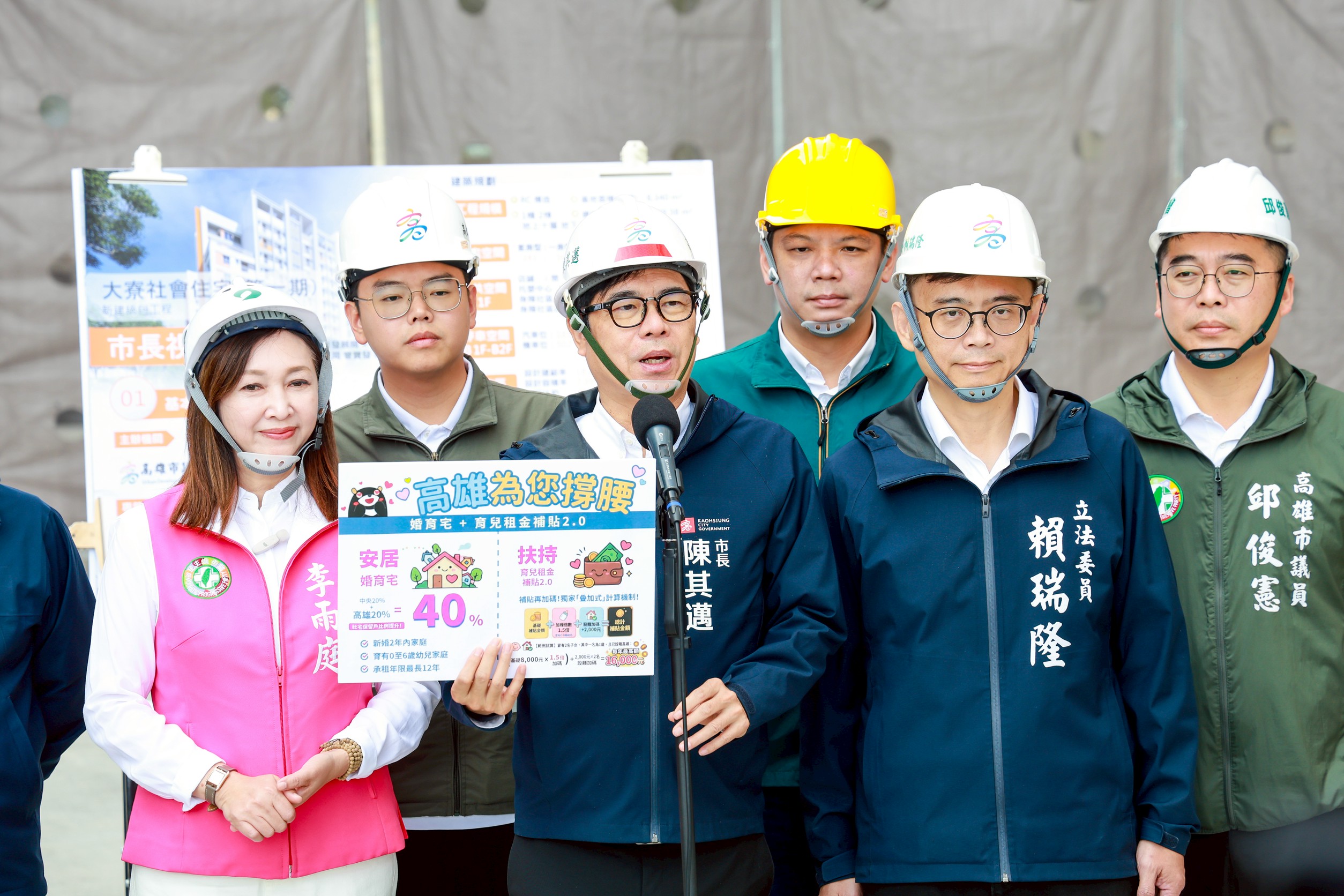 響應中央擴大照顧青年家庭政策,高雄市長陳其邁二十六日視察大寮社會住宅時宣布推出「婚育宅加碼」與「育兒租金補貼2.0」雙軌加碼方案。