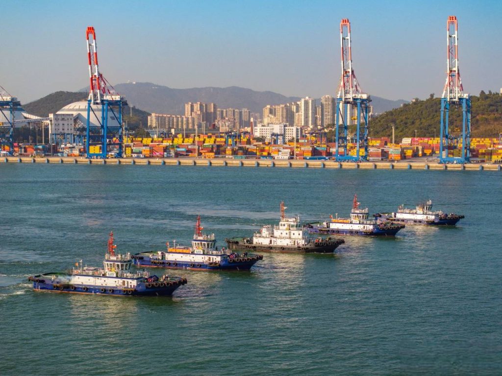 由廈門港務船務公司投資建造的四艘嶄新的純電拖輪在廈門港嵩嶼碼頭正式交付,象徵著大陸規模最大的新能源拖輪船隊建成投入營運,為其港口綠色轉型注入新動能。