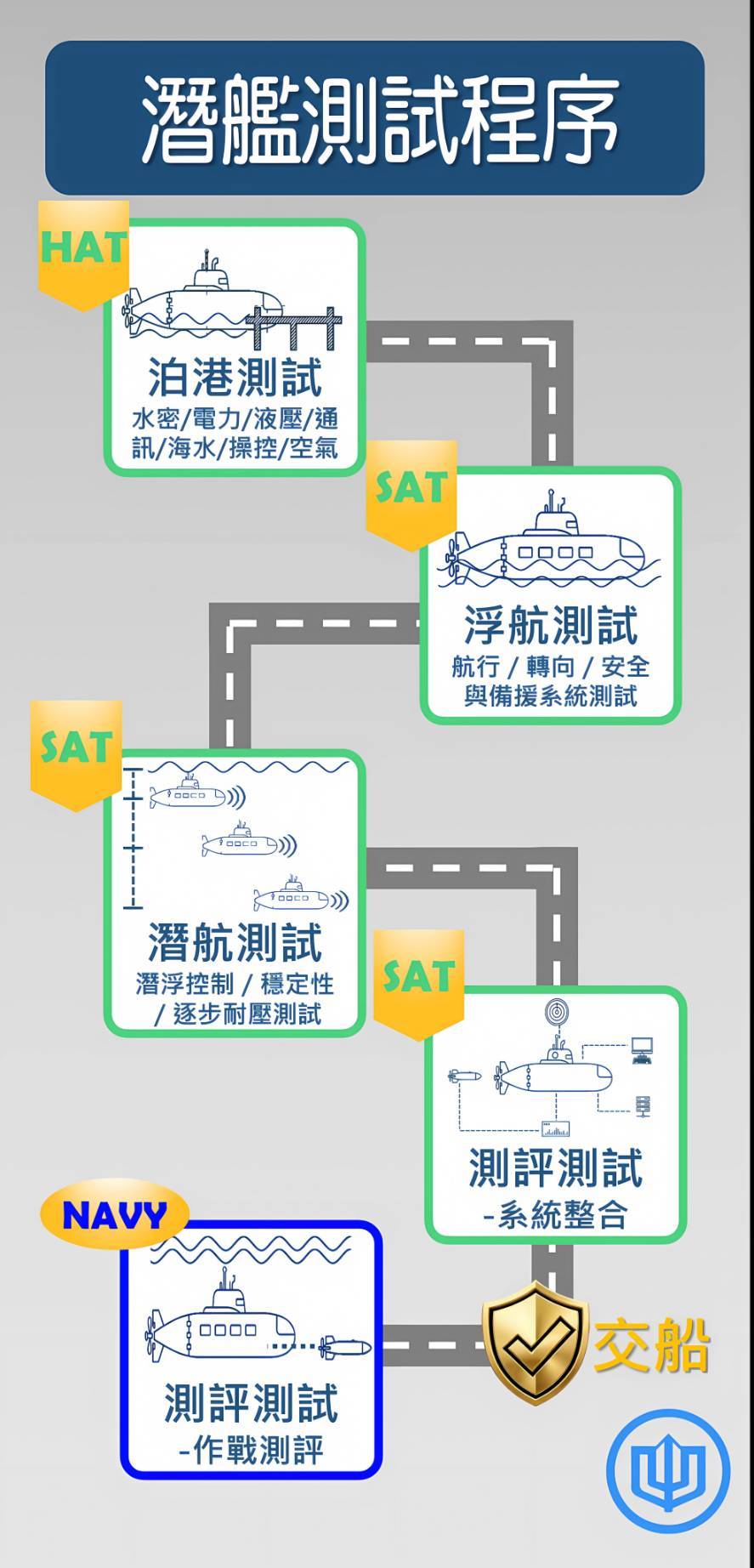 有關潛艦測試程序,台船談到潛艦完成建造後應通過哪些測試與水面艦艇主要差異,為保安全,並考慮複雜性,潛艦的完工測試須採分階段、多科目、多航次的漸進式測試方式,逐步發現問題、改善缺失、調校性能,潛艦測試的主要階段如下: